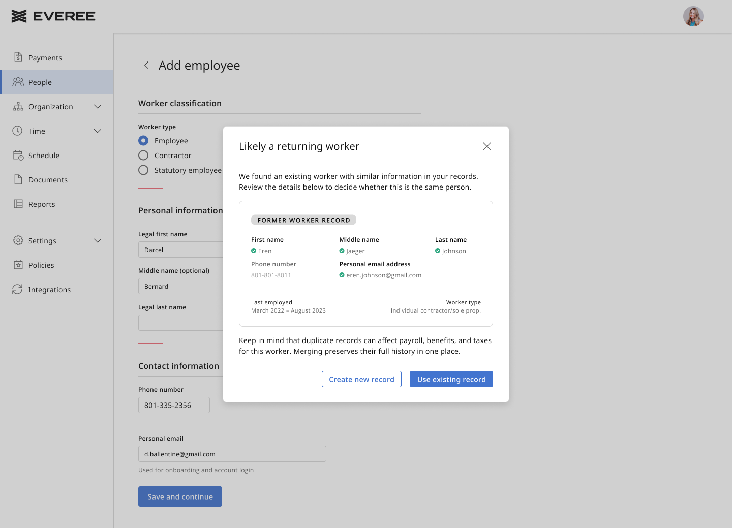 Our solution was to perform a fuzzy-logic check after the admin input the basic identifiers for a worker: legal first name, middle name, last name, phone number, and personal email address. We would search our database for a possible match and then surface it to the admin as the previous worker record and leave the final decision up to them: they can then choose to merge the two accounts into one record, or, in the case that the profile does not belong to the rehired worker, they can continue on to add it as a new record.