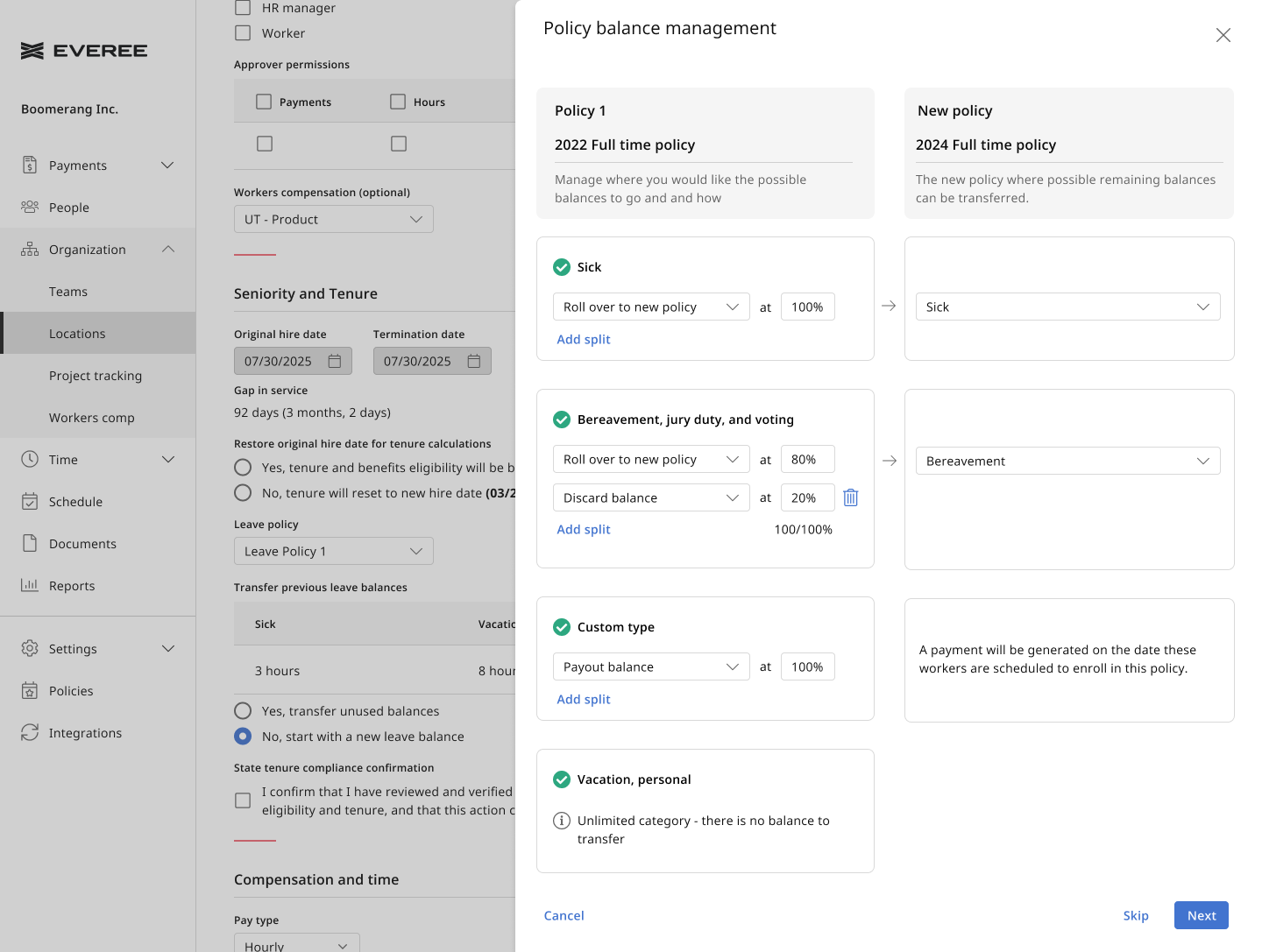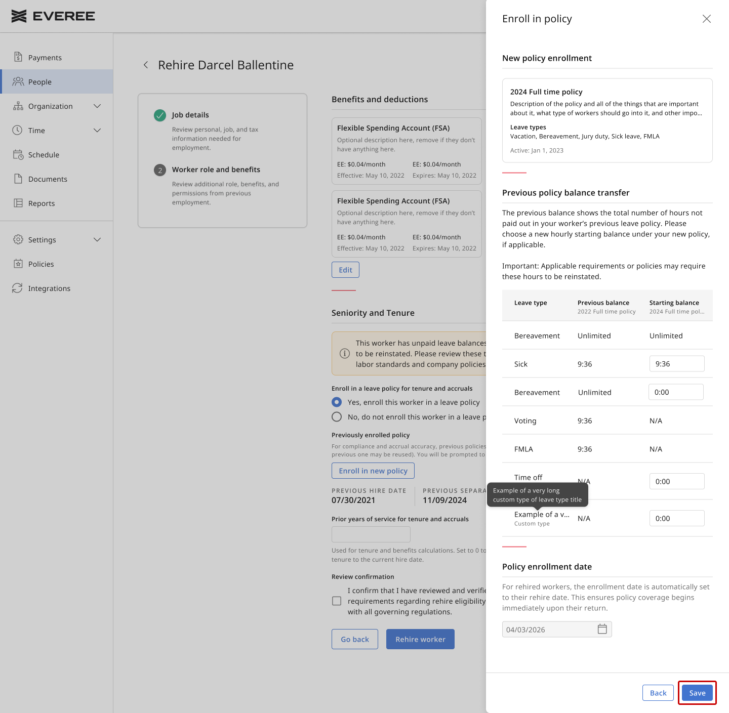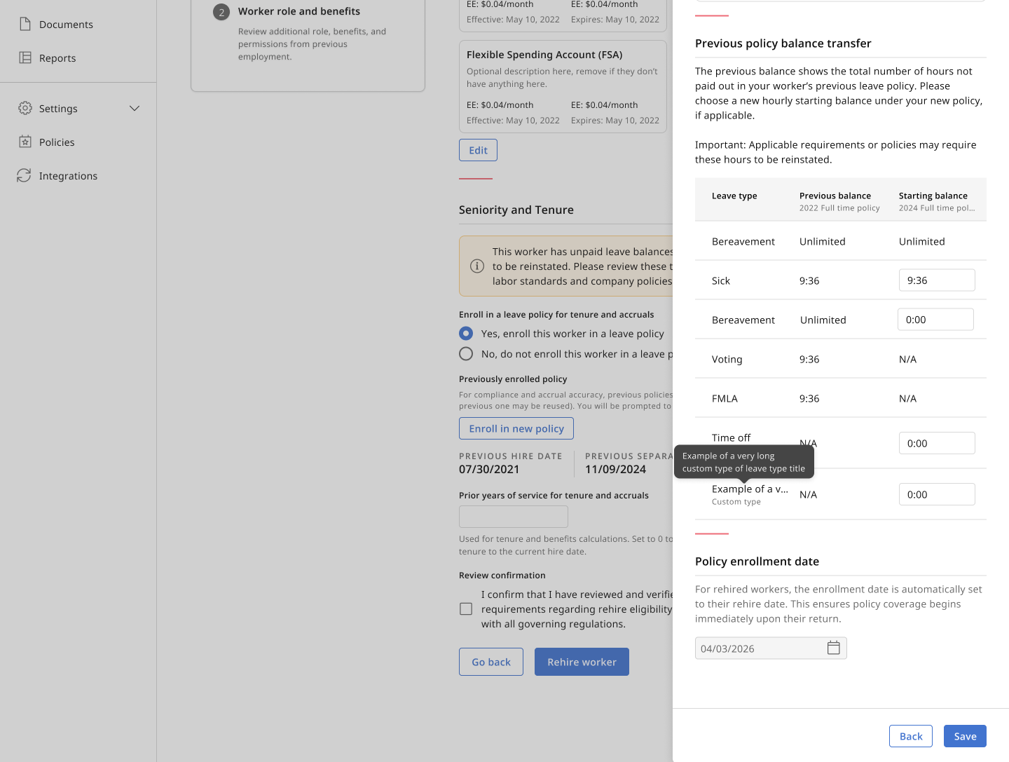 The smaller, flexible policy balance transfer that allows admins to enter starting PTO balances for the rehired worker in a more condensed slideout.