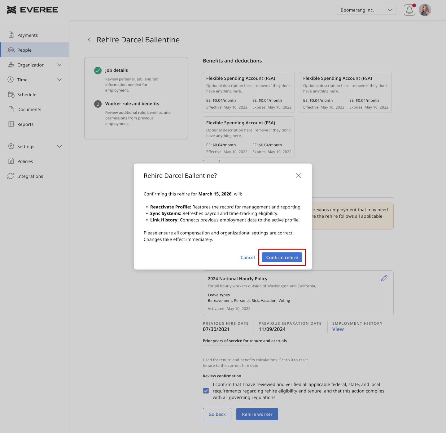 Previously, there was no way for admins to rehire a worker. They would have to create a duplicate, and then one of our devs (usually our CTO!!!) would have to go into the back-end to merge the two worker profiles in the backend.